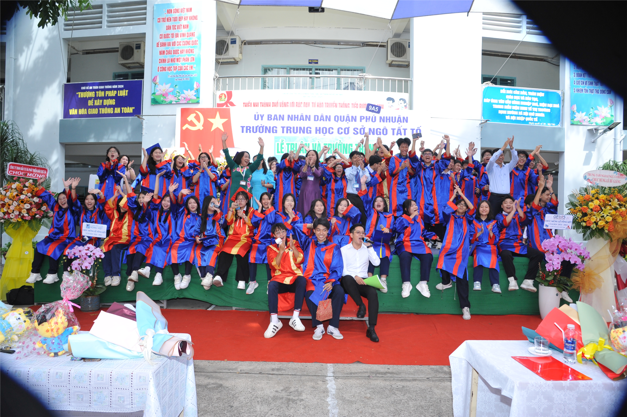 Học sinh khối 9 tặng những bó hoa tươi thắm để thể hiện lòng biết ơn sâu sắc đối với công lao dưỡng dục và dạy dỗ của cha mẹ các em.